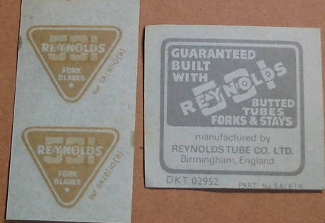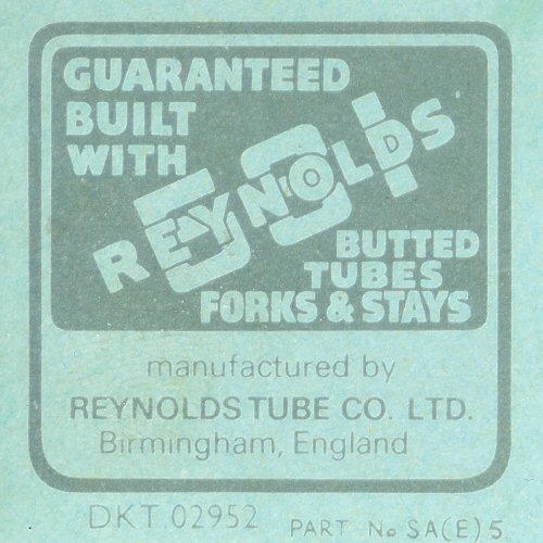 In 1974-75, Reynolds added the gold band and just tacked it onto the existing rectangular decal, producing a very unusual SQUARE decal. If you look at the left border of this decal, it's 1/3rd "Guaranteed Built With", 1/3 "531", and 1/3 gold band. This decal was used by Raleigh (who owned reynolds) but not by anyone else, except perhaps Holdsworth (I think I saw one once on a Holdsworth.)